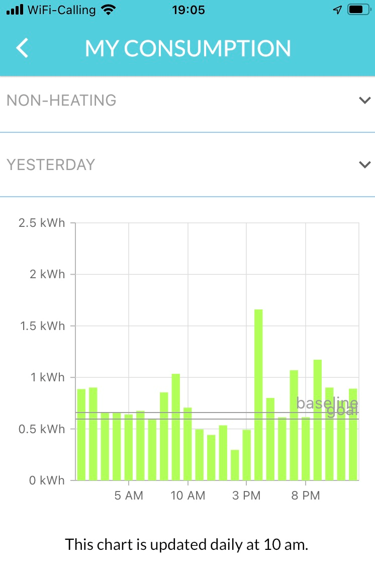If you consumed less energy than your baseline, the background is green: you saved energy! While if you consumed more than your starting point, the background is red. Keep on trying to save! Your baseline is always your average consumption collected from the last month.
