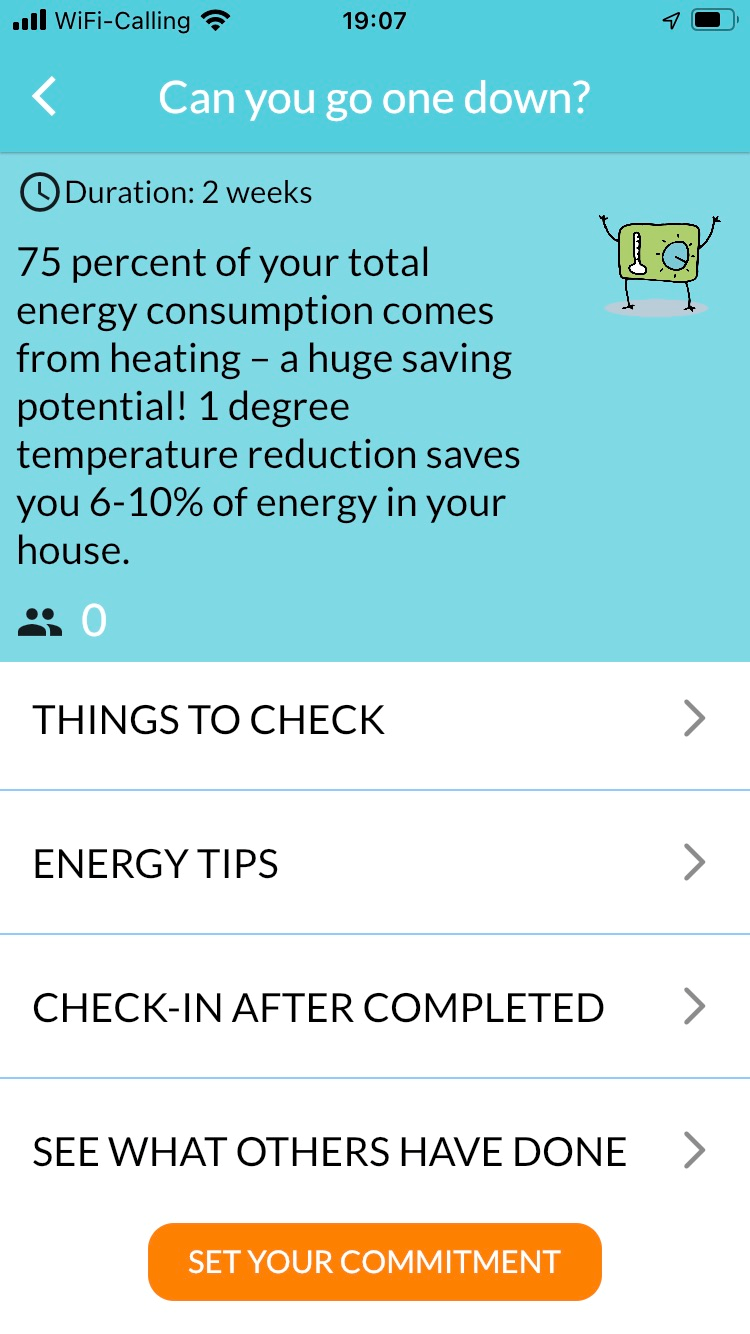 They are organized around different themes of energy use at home and new topics come up every two weeks. In each theme you find different tips and an indication of their impact.